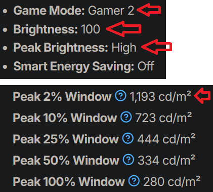 Und je nachdem welchen Bild Mode und welche Peak Brightness EInstellung du halt gewällt hast im Monitor Menu ändert sich halt auch der 2 % Peak Bereich ... und man sollte dann in der im Game Menu