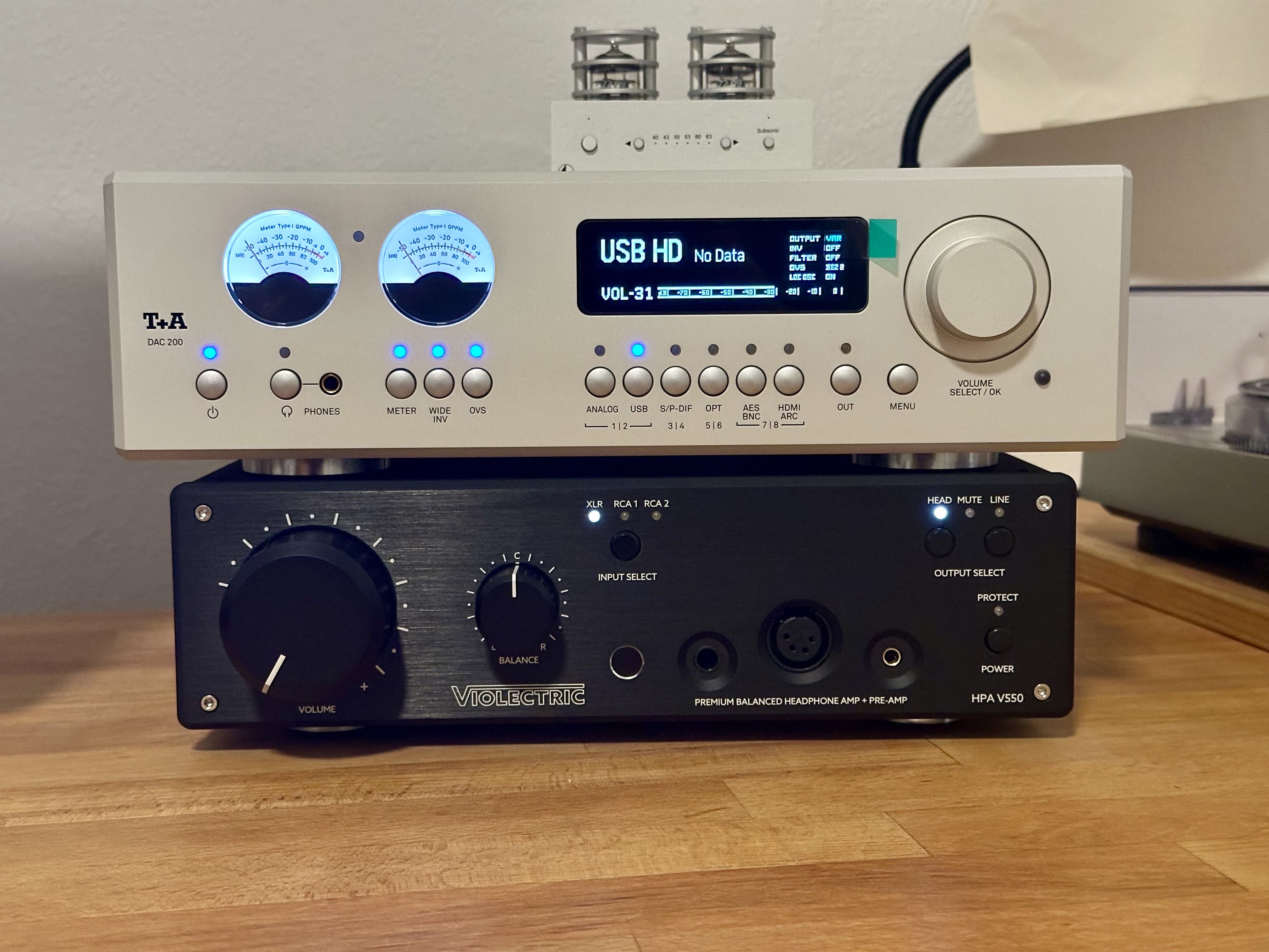 Das einzig Doofe ist, dass der Fusion Core die Verbindung nach vorne hat. Mit dem Burson Mothership geht das noch halbwegs, weil du das mittig unter dem Gerät wieder nach hinten führen kannst, aber das ist schon irgendwie voll der Fail, dass die Verbindung da nach vorne geht. Denn beim Soloist/Conductor ist der Eingang dafür ja auch hinten. Das hat etwas von der Magic-Maus von Apple, wo du die Bluetoothmaus umdrehen musstest um sie zu laden