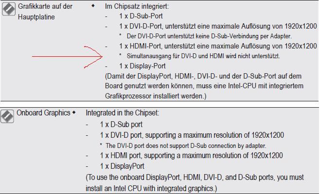 Hat jemand ein H67MA-UD2H? Irgendwie werde ich aus dem handbuch nämlich nicht so ganz schlau. Laut der dt. Version wird der "Simultanausgang für DVI-D und HDMI nicht unterstützt" in der englischen Version steht davon jedoch nichts. Kann ich jetzt je einen Monitor an den DVI und einen an den HDMI hängen oder muss ich den DP und einen der anderen nutzen?