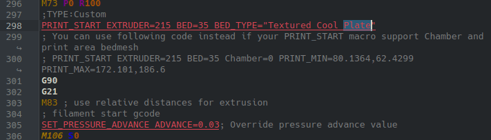 ; PRINT_START EXTRUDER=[nozzle_temperature_initial_layer] BED=[bed_temperature_initial_layer_single] Chamber=[chamber_temperature] PRINT_MIN={first_layer_print_min[0]},{first_layer_print_min[1]} PRINT_MAX={first_layer_print_max[0]},{first_layer_print_max[1]}