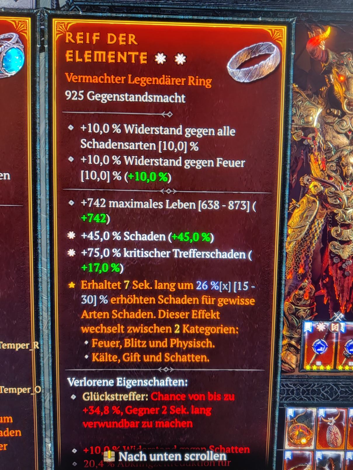 Leider nicht sonderlich viel wert. Nicht komplett wertlos, aber Damage % ist halt nicht wirklich prickelnd. Ringe ohne GA Crit Chance tun sich erfahrungsgemäß sehr schwer. Kenne jetzt nicht die aktuellen Preise, weil seit 2 Wochen auf Pause… aber mehr als 200 - 400 Millionen wird er wohl nicht wert sein… wobei bei der massiven Goldinflation, kann ich da echt nicht mit 100% Sicherheit den Wert taxieren. Aber definitiv kein Ring, den dir die Leute aus der Hand reissen werden. Wobei er hat die 10% Feuer Resi, das ist ein Pluspunkt weil die meisten Barb Builds einen Ring mit 10% Feuer Resi brauchen… weil sie nach Paragon und allem bei 60% Feuer Resi sind und dann wäre ein Ring mit den 10% Feuer Resi ideal und brauchen damit ein Item weniger mit Resi. Das *könnte* eventuell seinen Preis etwas erhöhen… wobei die Barbs, die so gescheit ihren Char planen, wahrscheinlich keinen Ring ohne GA Crit Chance in Erwägung ziehen. Denn die Masterworking Crits sollen bei Ringen ja auf die Crit Chance und das macht nur Sinn, wenn die GA ist.