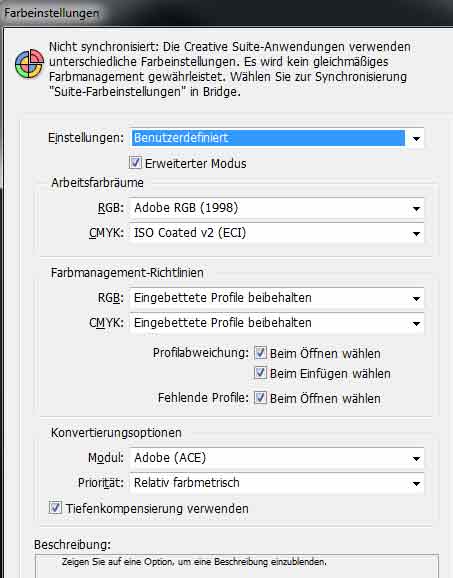 Um es zu verdeutlichen, habe ich drei Screens mal angeheftet um zu zeigen, wie meine Farbräume eingestellt sind. Es kommt definitiv bei der Umwandlung von RGB nach CMYK zu Farbverfälschung jedoch find ich den verdammten Fehler nicht!