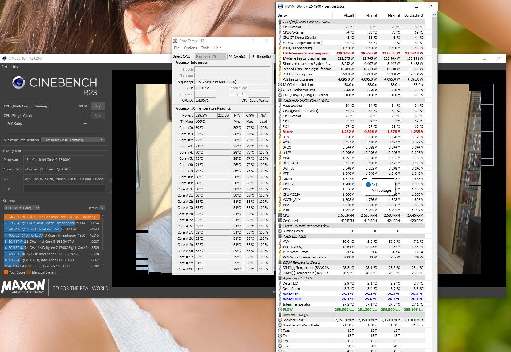 Mein 13900KF läuft jetzt auch. SP 101 :bigok:. Hab ihn mal testweise ohne alle Limits laufen lassen bei CB20, da war ich bei 330W direkt auf 100° Coretemperatur - Vcore war da glaub ich über 1.4V. Aber trotzdem 15600 Punkte oder so. Hab dann die Powerlimits im Bios aktiviert, dann läuft er bei CB20 auf ca. 79-84°C, bei 253W, bei 25 Grad Wassertemperatur mit EK Fullcover Block und Thermalright Contact Frame, Vcore und alles komplett auf Auto. Danach noch 14.400 Punkte bei CB20, hatte aber auch allerlei Anwendungen laufen.