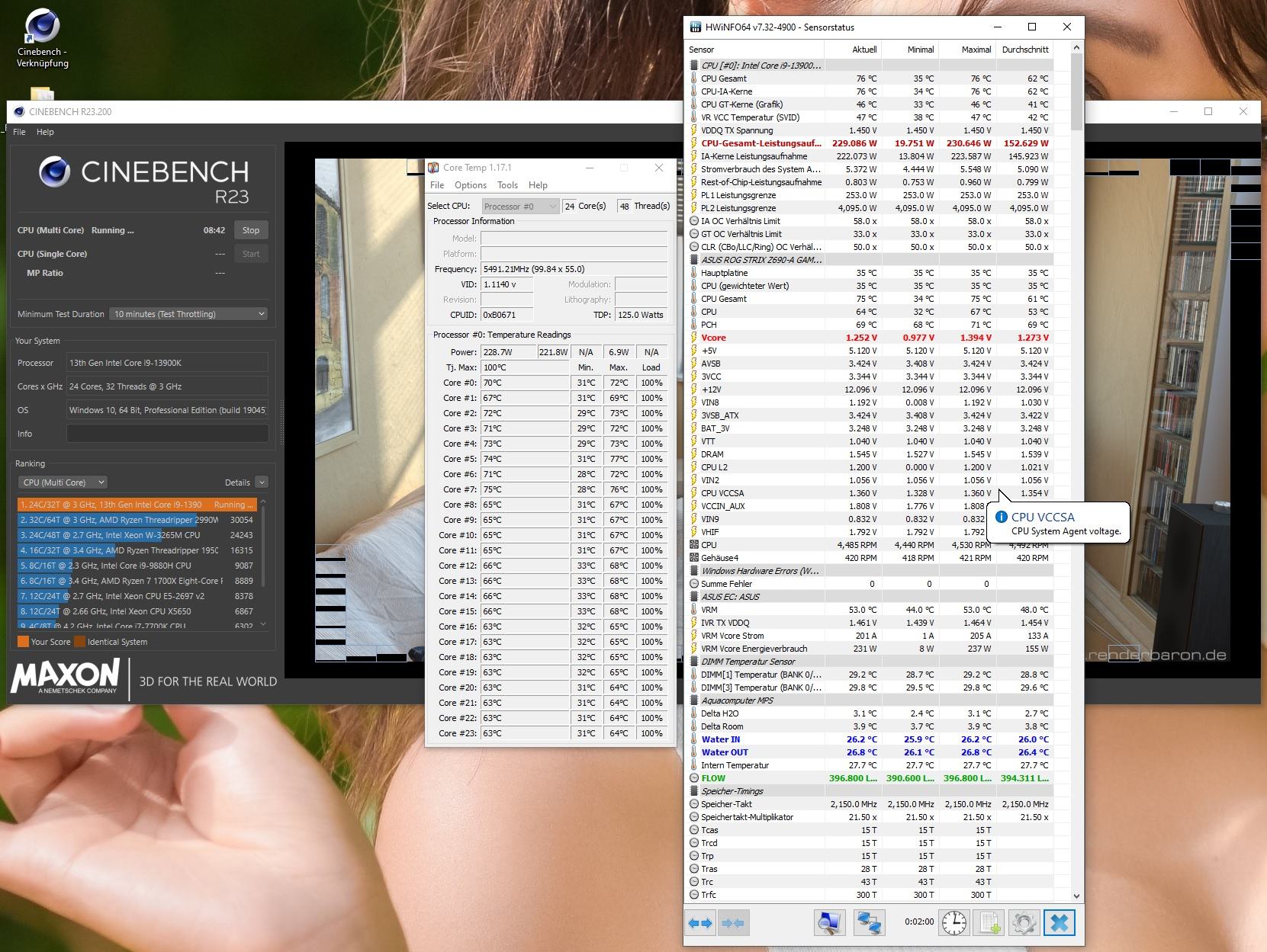 Das Ergebnis ist sehr zufriedenstellend. Nach 20 Minuten Cinebench ist der heißeste P-Core bei 87°. Vorher mit dem Velocity² 1700 98°C.