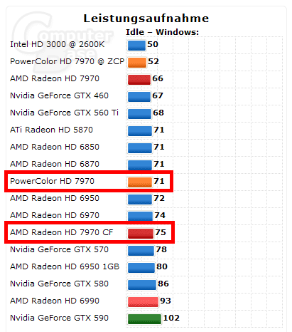 Die 2te HD 7970 geht in ZP, dann sind wir bei 75 Watt (mit nur einer HD 7970 sind es 71 Watt und wenn beide HD 7970 in den ZP gehen, sind es 54 Watt - letzteres ist nicht im Diagramm).