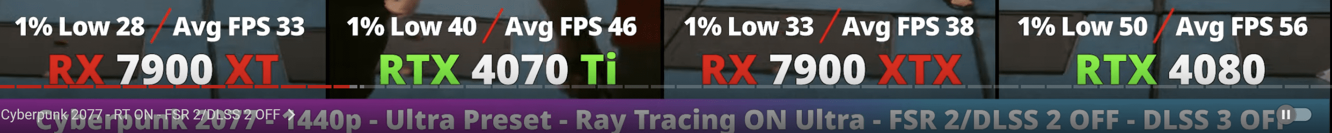 Warum vergleichst du die 7900XTX mit einer 4070ti, dass macht keinen Sinn, auch wenn der Preis nahezu identisch ist. Bei der reinen Rechenleistung kann man die 7900XTX nur mit einer 4080 vergleichen, ergo auch beim Raytracing.