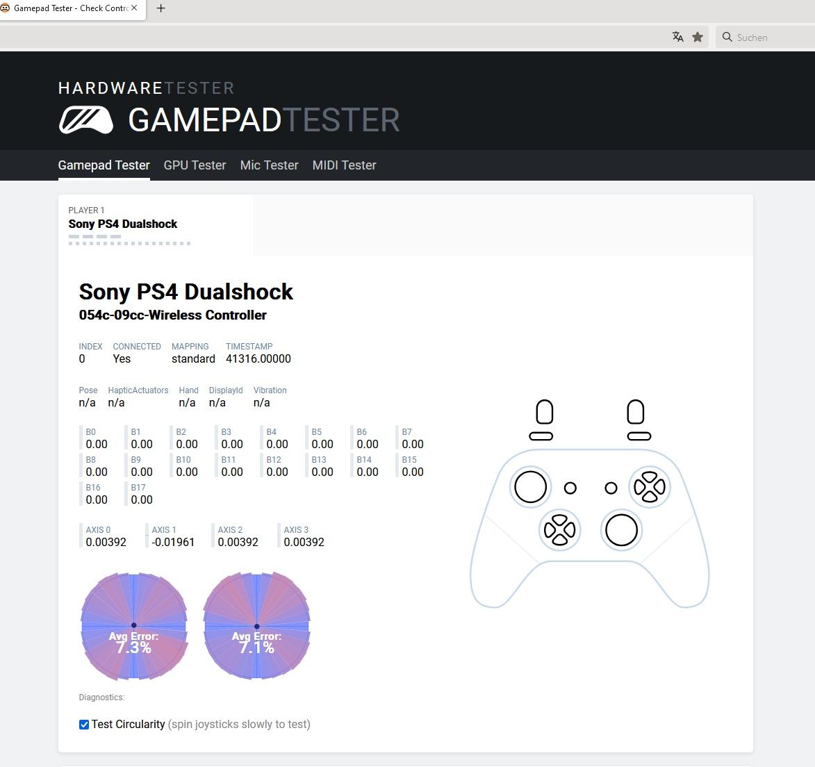 Einen kurzen Test beim Gamepad Tester (https://hardwaretester.com/gamepad) habe ich auch gemacht.