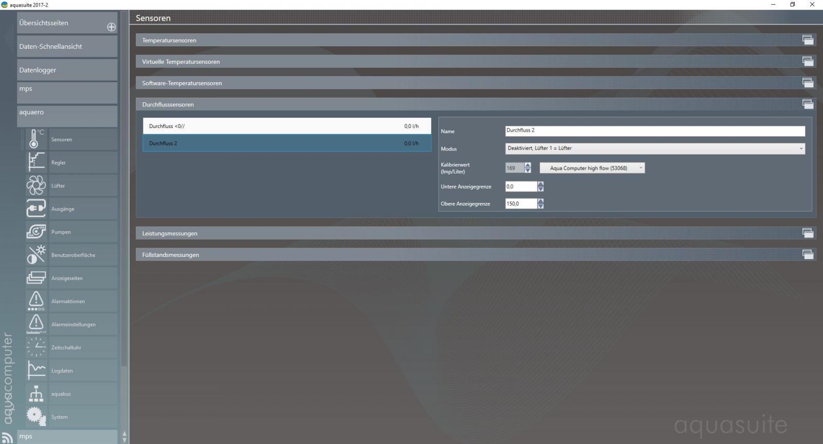 Der Kalibrierwert ist bei den alten Sensoren (also konkret aus dem AQ-Shop dem Durchflusssensor mit 5,6 mm Düse, G1/4 von Digmesa und dem Durchflusssensor high flow G1/4 für aquaero, aquastream XT ultra und poweradjust), die am flow-Anschluss angeschlossen werden, wichtig.