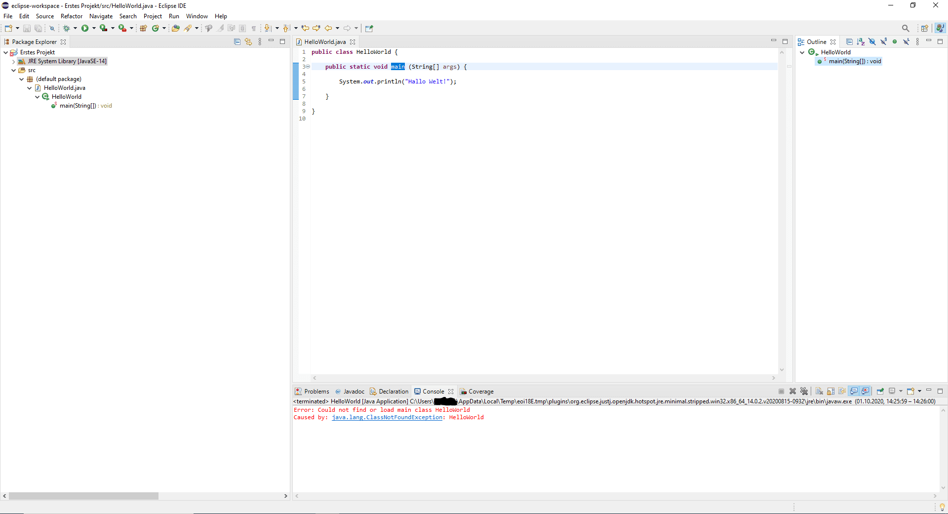 Ich habe Java 15 JDK + Eclipse Java installiert und egal was ich mache, er findet beim kompilieren die main Klasse nicht.