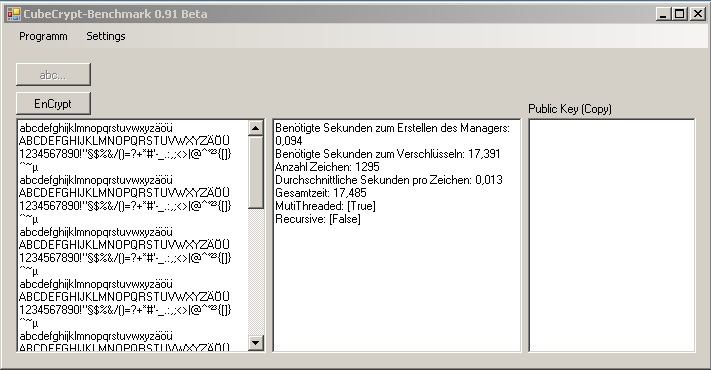 Ich habe seit geraumer Zeit an einem eigenen Verschlüsselungsverfahren für Texte (später auch für Dateien) gearbeitet und bin nun so weit, eine Beta-Version zu veröffentlichen, um die Leistung auf möglichst vielen verschiedenen System zu erproben.