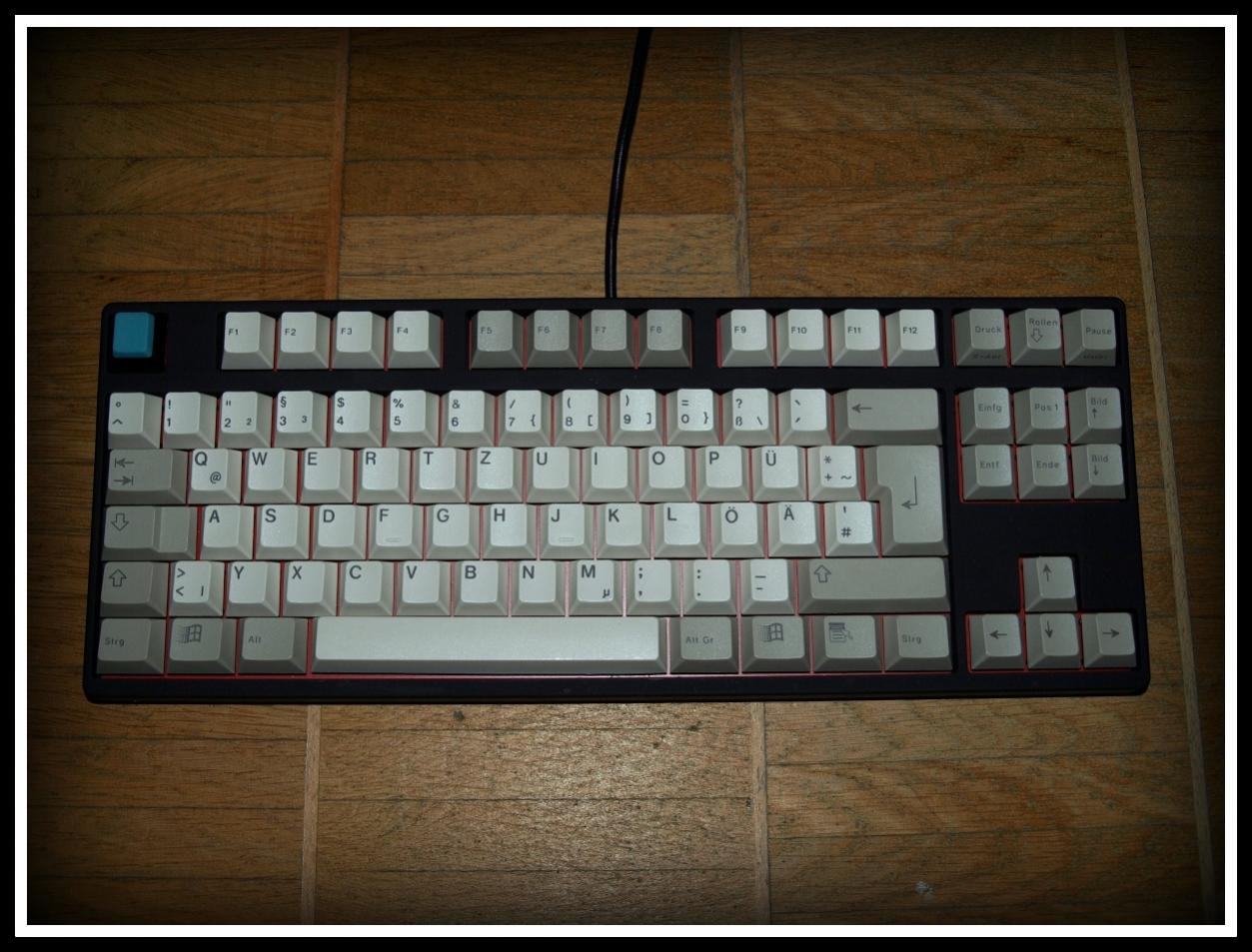 der Rest ist modifiziert, Grundboard ist ne CM Storm Quickfire Rapid Red mit Kappen einer G80-3000, wobei man bei den G80ern leider noch die MX-Aufnahmen versetzen muss, da die Capslock- und Spacetaste Off-Centered montiert ist.