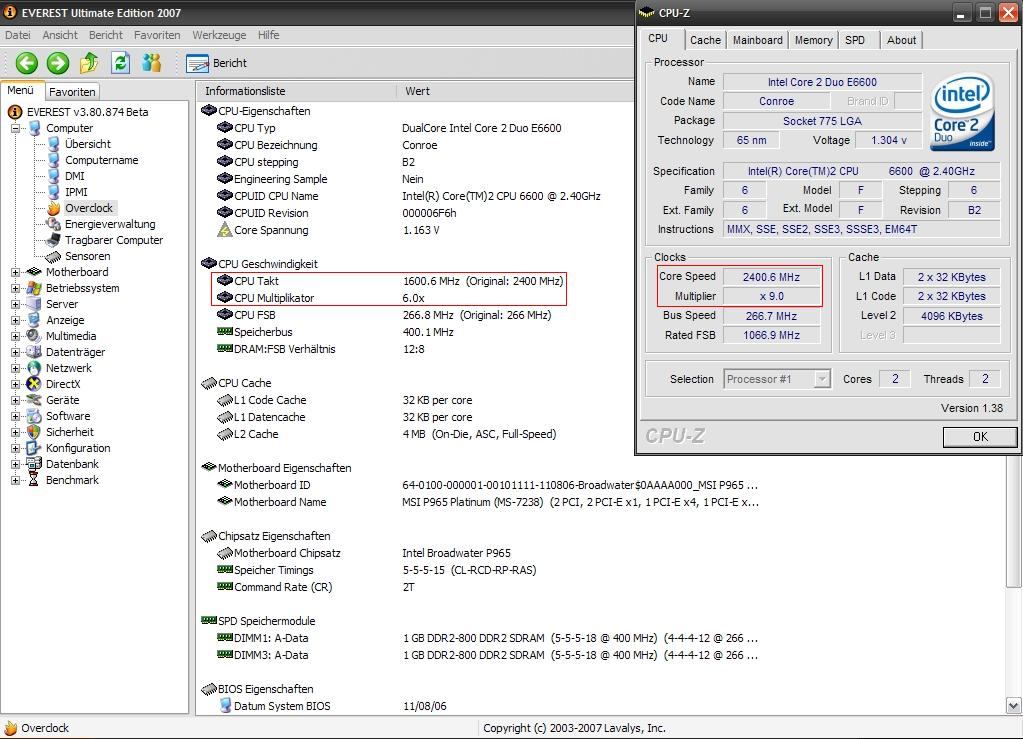 bin grad aufgestanden und hab da auch gleich mal ne frage.... und zwar hab ich vor kurzem feststellen müssen, dass bei Everest mein CPU-Takt "falsch" ausgelesen wird.... Es sieht aus, als ob EIST an wär, obwohl ich es ausgeschaltet hab im BIOS. CPU-Z zeigt mir aber den richtigen Takt an.... was soll ich jetzt glauben??? Ist das nur ein Softwarefehler von Everest oder ist EIST doch an??? Im Anhang hab ich mal en Pic hochgeladen, damit ihr euch selber ein Bild davon machen könnt. Hoffe auf positive resonanz