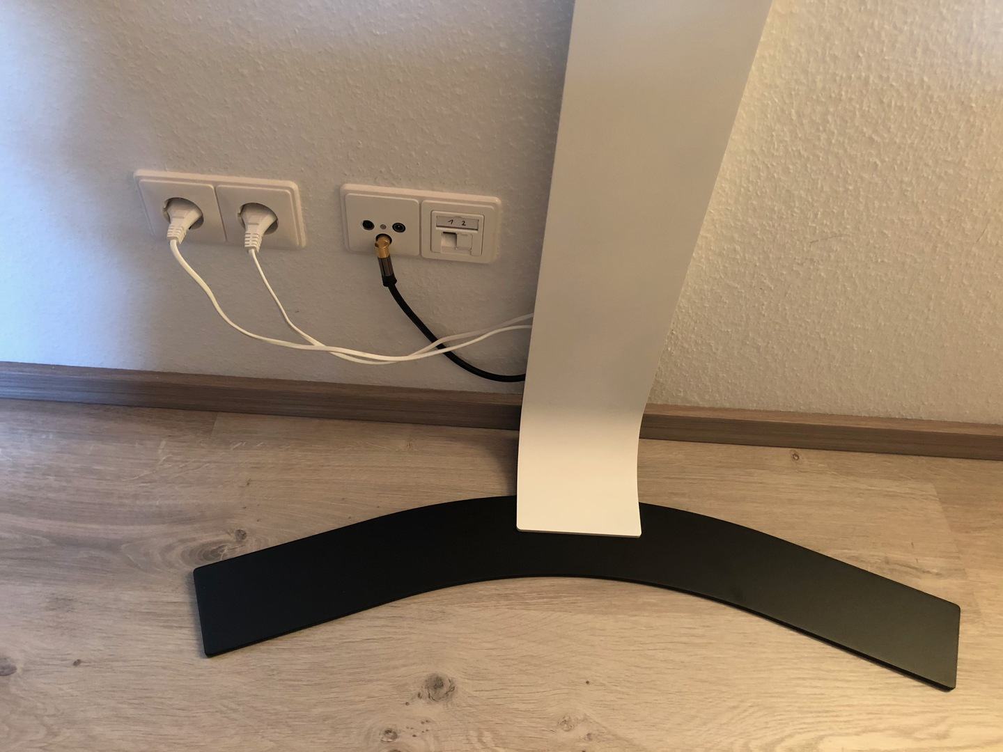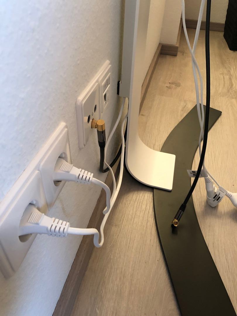 Ich habe in diesem Fall zwei Stromkabel gebraucht, einmal für den Fernseher selbst, das andere für mein Apple TV 4K. Zusätzlich habe ich noch das Satellitenkabel. Auf Ethernet habe ich verzichtet, mein Repeater ist Leistungsfähig genug, daher setze ich hier aktuell auf W-Lan. Aufgrund der recht Hohen Position des Fernsehers, komme ich um eine Stromkabelverlängerung nicht herum.