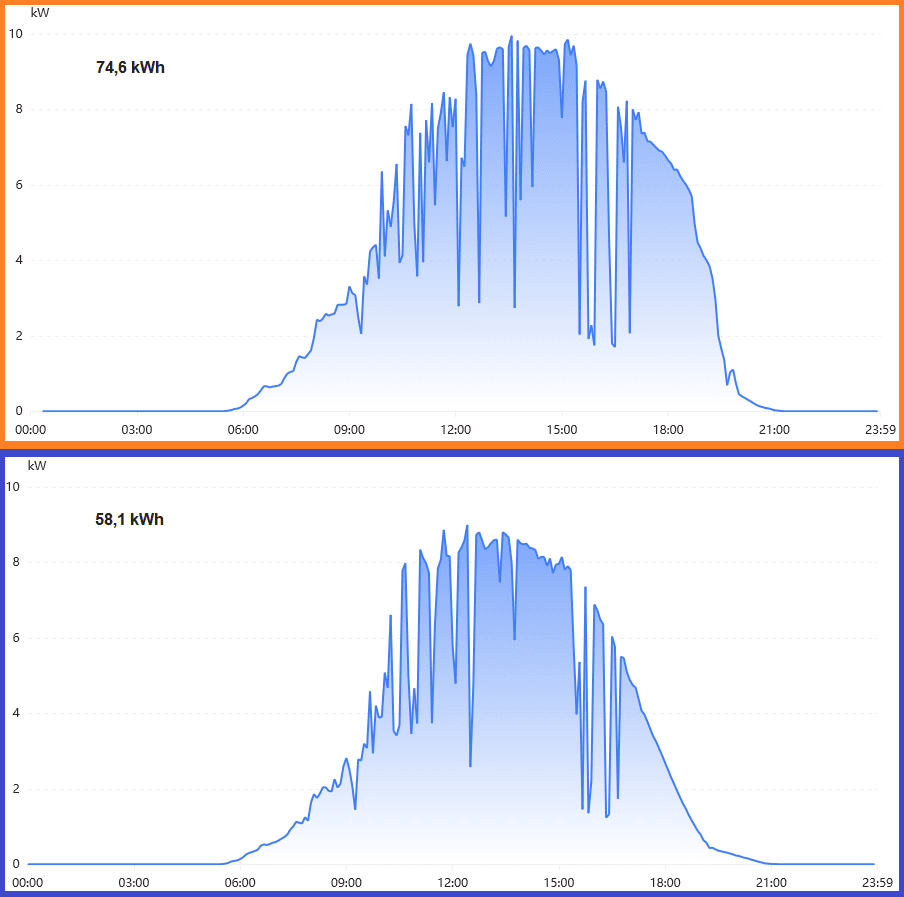 die obere Kurve (oranger Rahmen) ist eine 15,6 kWp Anlage mit Ost/West Ausrichtung und leichter Verschattung morgens.