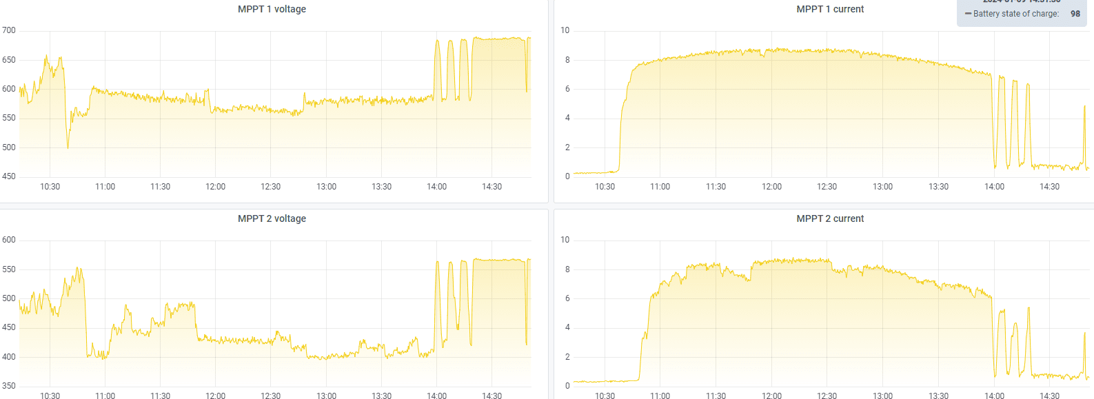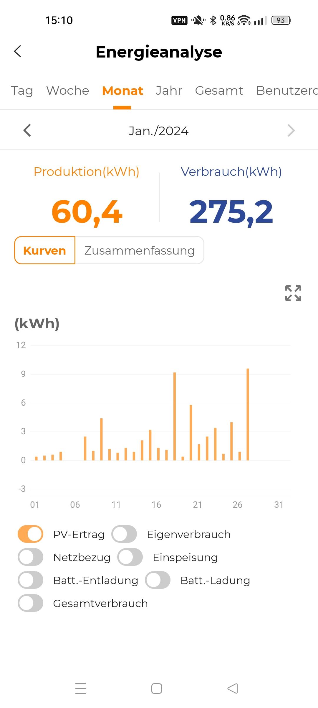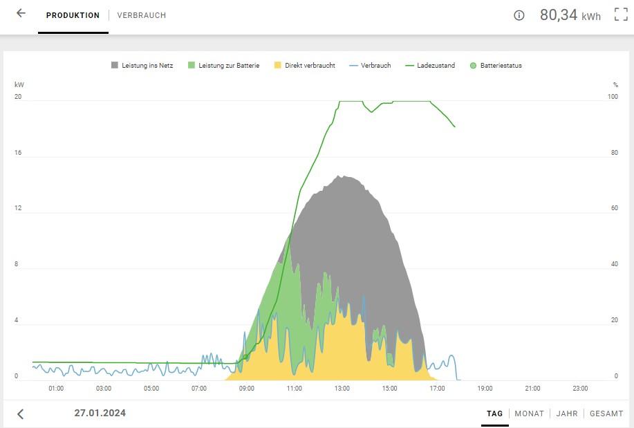 Dass deine Sorgen völlig unbegründet sind, kann ich dir noch anhand des Verlaufs am 9.1 beweisen. Und das war strahlender Sonnenschein bei ca -15°C. Kälter war es hier in den letzten Jahren nie. Und ja, Klima ändert sich, Extreme nehmen zu blabla. Dann hab ich halt beim nächsten -50°C Winter nen "F52". Wobei ich da absolut nicht dran glaube. Zur Not könnte ich ein Modul noch an String 2 anklemmen. Aber dann würde ich etwas Sonne am morgen "abgeben"