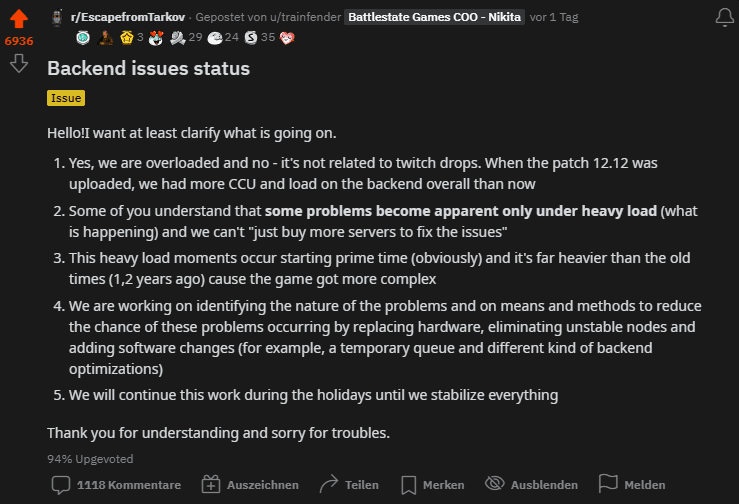 Das hat Nikita gestern bzgl. der aktuellen Serverlage von sich gegeben. Mal sehen ob und wenn ja, wann sich da was tut. Bin vorhin allerdings in weniger als 5 Minuten durch die ca. 20k Warteschlangenplätze gekommen und hab auch sonst keine Probleme. Bin allerdings auch heute das erste Mal seit 2 Wochen wieder am zocken und hab den Feiertagepeak nicht mitbekommen. :d