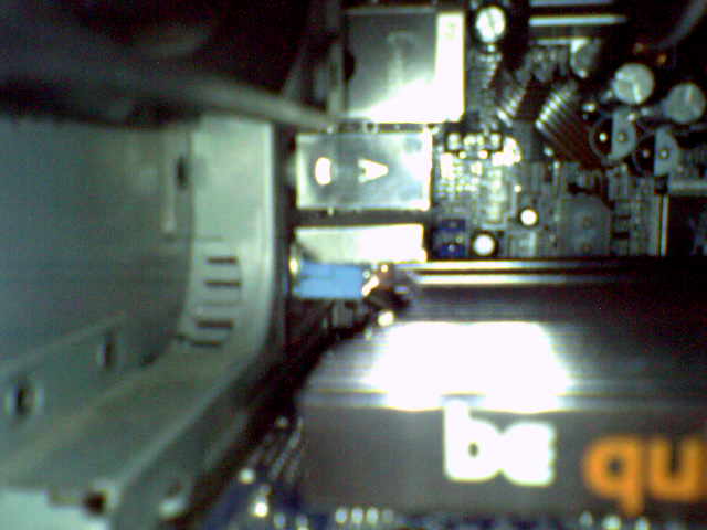 Passiv Kühlung auf der Graka Montiert. Wollte aber nicht so ganz rein. Ich gekuggt woher. Scheisse, Sound eingänge von Mobo im weg, gut ich denk, hast ja noch ein 2. Steckplazt. Dort rein. Scheisse, der Zalman Kühler vom mobo zu hoch. Hmpf, ich denk was machste jetzt, willst ja nicht direkt 30€ im Müll kloppen. Also ich noch mal zum Steckplazt eins und gekuggt was da weg muss. :coolblue: