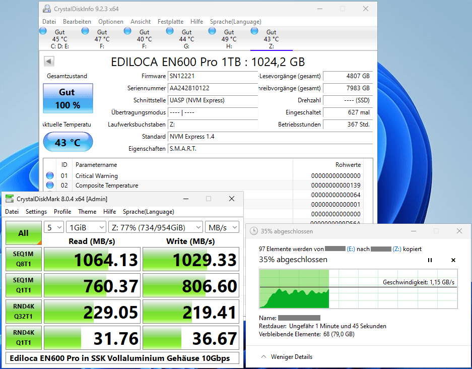 ist ja auch soweit OK, mit USB 3.1 oder 3.2 ist ja wesentlich mehr nicht möglich, insofern man auch richtiges Kabel nimmt.