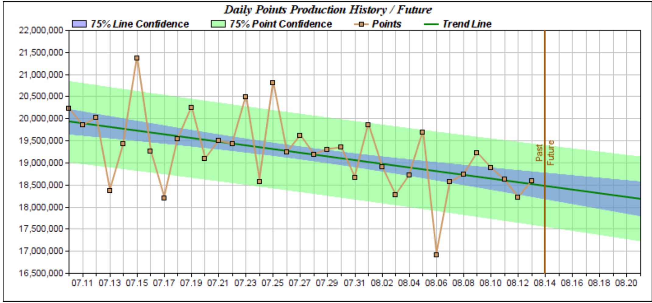 Sowas hab ich immer mal wieder beobachtet. Ich vermute mal dass das an der Zusammensetzung der angebotenen WUs liegt. Je nach dem was gerade alles verschickt wird ist der MIX ertragreicher, bei geringerer Laufzeit. Es gab mal Zeiten, da hab ich mit dem alten Setup bis zu 18 Mio gemacht. Dann zwischenzeitlich nur 14-15 Mio . Jetzt mache ich mir Upgrade, wenn’s hoch kommt, 19mio.Wurde was an den WUs oder Punkten geändert? Mein NUC schafft nur noch ~100k PPD. Bisher warens je nach WU meistens 130-150. Der NUC läuft aber normal, CPU-Last, Takt und Stromverbrauch sind wie üblich. Nur weniger PPD und/oder längere Laufzeiten.