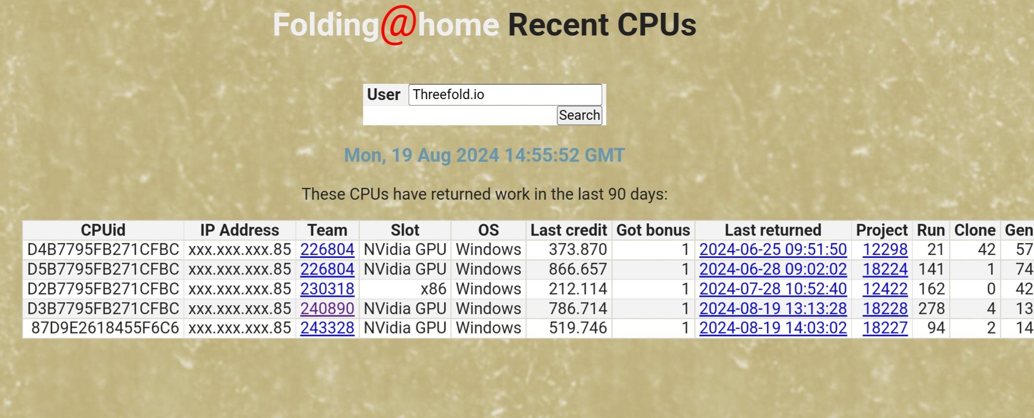 Wobei wir weder in der, noch in der F@H Userliste von Threefold auftauchen. Eventuell gibt es da ein Mengenlimit in den Anzeigen.