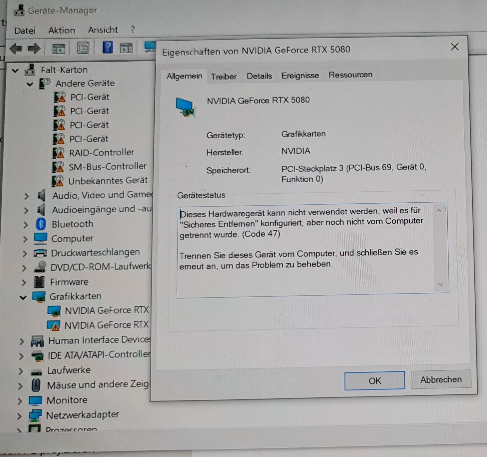 Selbst die Matrix hab ich dort gangbar machen können, aber die 5080 verweigert absolut den Dienst. Der F@H Client erkennt sie, aber selbst im Geräte-Manager taucht sie nicht auf und entsprechend kann der Client sie auch nicht benutzen
