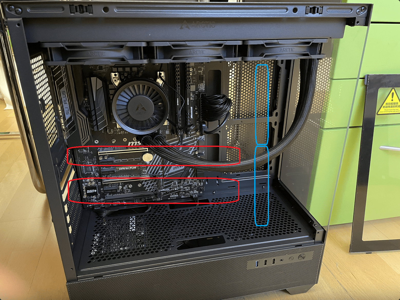 Auf der Grafik würde vielleicht der untere ausreichen, aber ich selbst versuche auch die Oberseite der GPUs zu belüften, da ja Wärme bekanntlich nach oben steigt und auch die Platine/Backplate ja welche abstrahlt, die ja dann bei Speicher, CPU und Stromversorgung des Boards landet ;)
