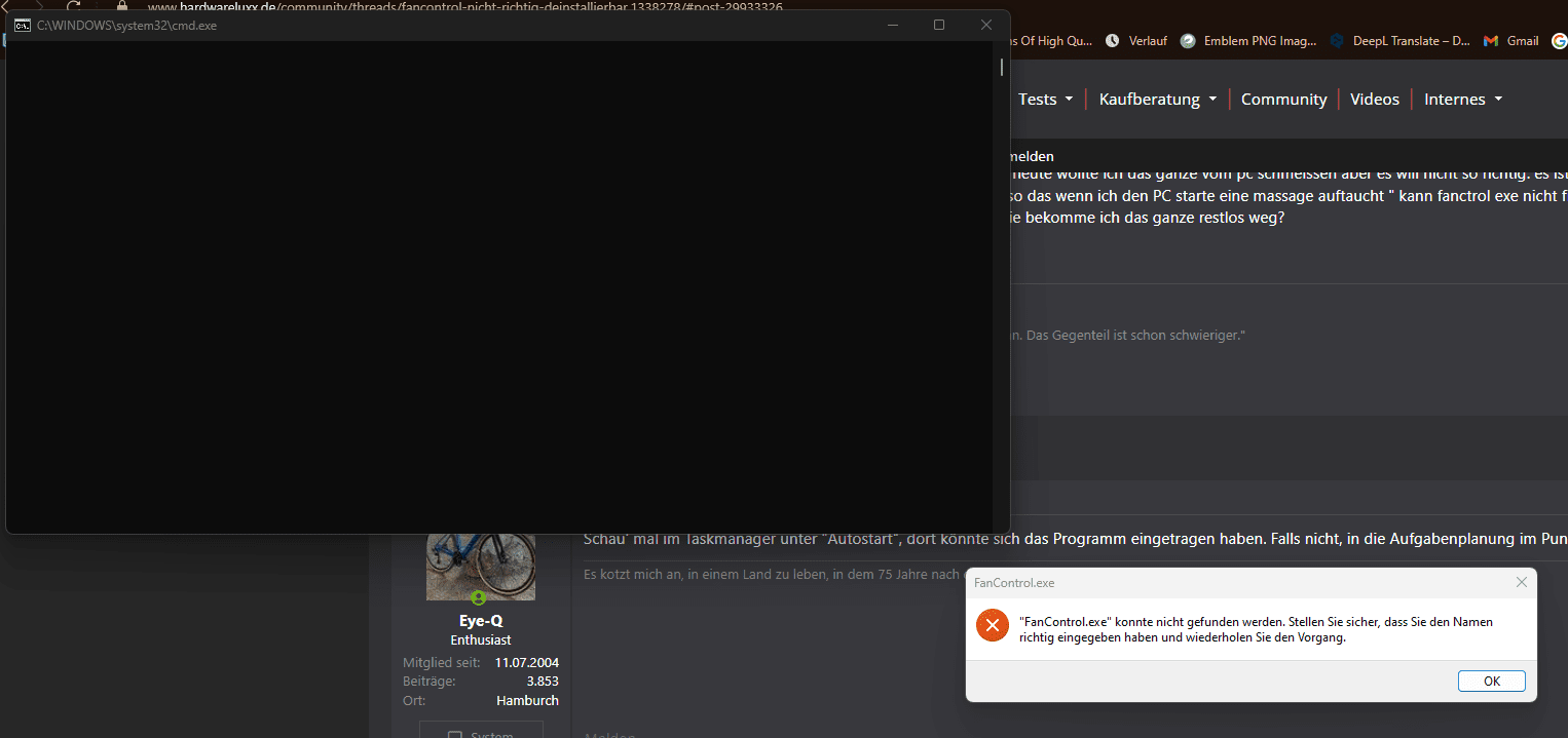 ich nutze schon länger fancontroll zum steuern meiner lüfter. heute wollte ich das ganze vom pc schmeissen aber es will nicht so richtig. es ist kein " installierbares" programm sondern nur eine exe. laut internet soll man nur alle sachen lösche müssen und es ist weg. bei mir ist es aber so das wenn ich den PC starte eine massage auftaucht " kann fanctrol exe nicht finden" dahinter öffnet sich eine CMD system 32 terminal dialog ohne inhalt. scheint irgentein registry oder systemstart eintrag zu sein... wie bekomme ich das ganze restlos weg?