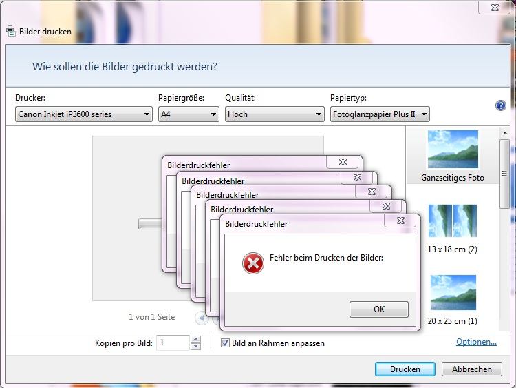 Seitdem ich ein Drucker&Scanner-Multifunktionsgerät installiert habe, kommt, wenn ich ein Bild über die normale "Bilder-Drucken" Funktion von Windows 7 drucken möchte, mehrmals die Fehlermeldung "Fehler beim Drucken der Bilder" hintereinander. Bei meiner vorherigen Windows-Installation trat dieser Fehler nicht auf (ebenfalls dieser Drucker installiert). Anbei habe ich mal ein Screenshot zu diesem Fehler.