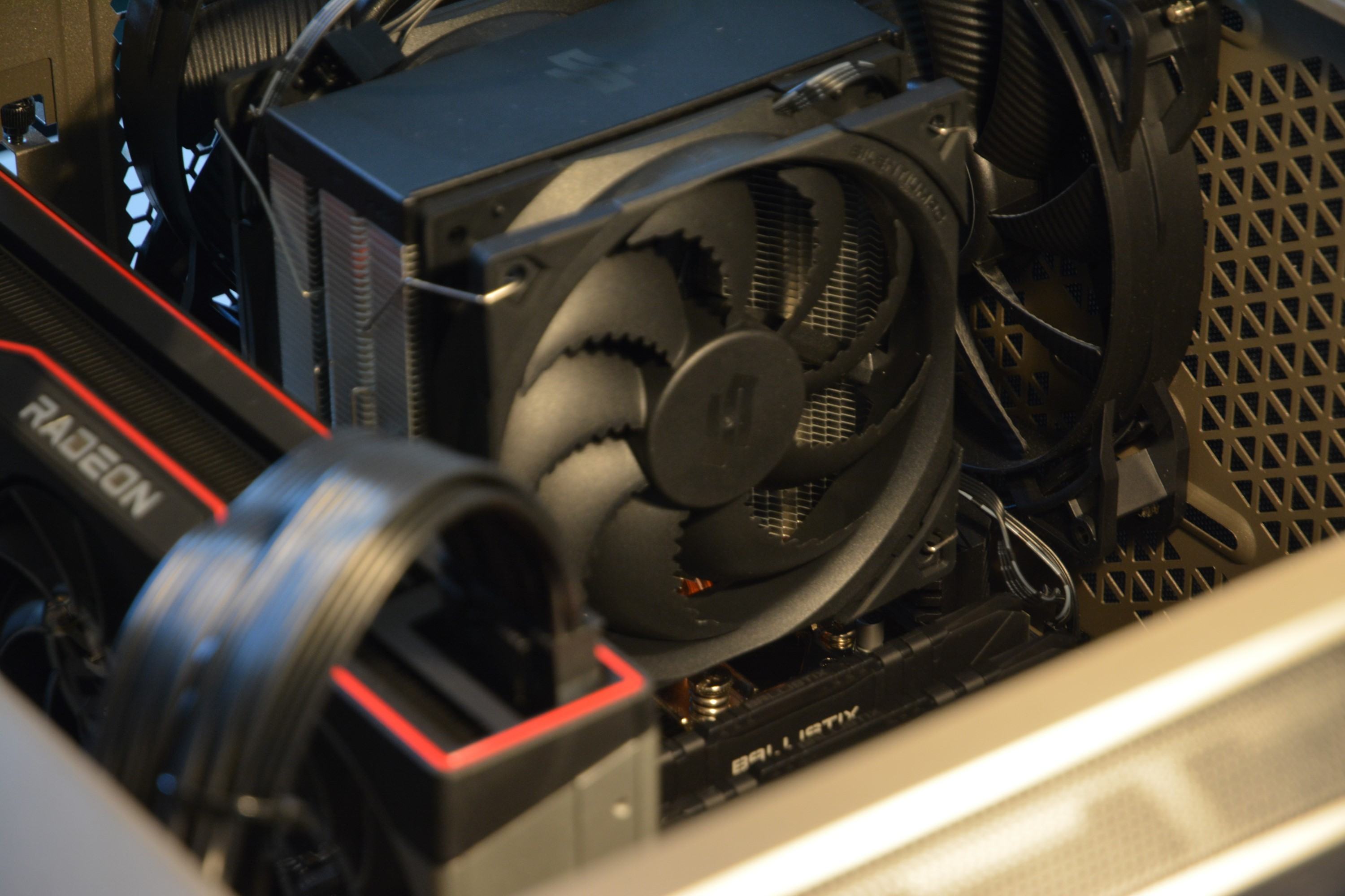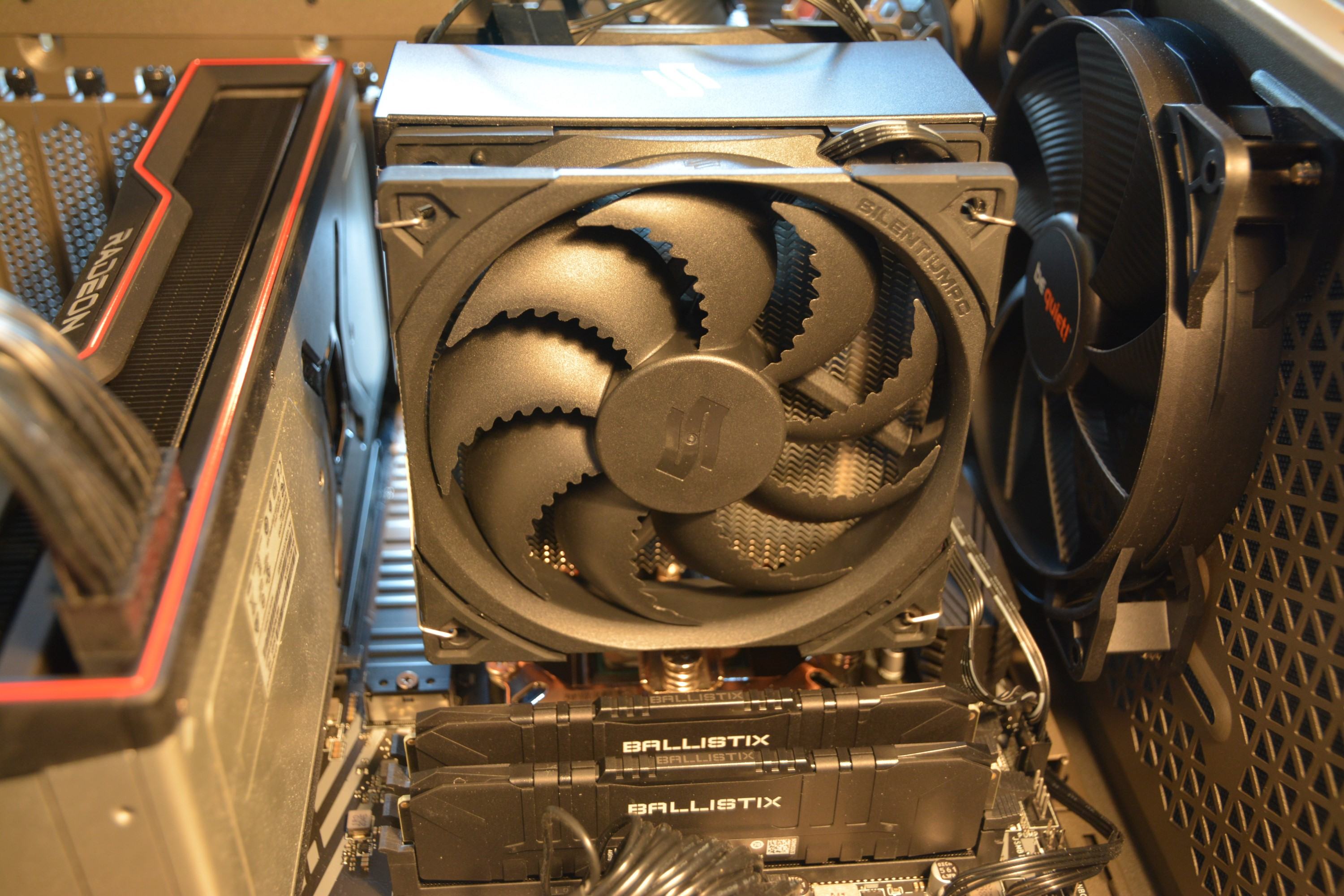 Der Umbau vom AMD Wraith Kühler auf den Fera 5 hat sich als einfach und relativ schnell herausgestellt. Wo fängt man an? Genau, bei der Anleitung! Die war gut zu verstehen und führt auch alle nötigen Schritte für AM4 auf. Da der Wraith Kühler die normale Backplate und keine Brackets auf der Vorderseite verwendet, musste ich nur den alten Kühler abschrauben und konnte gleich den AM4 Bausatz von SilentiumPC drauf schrauben. Bei meinem Gehäuse hätte ich auch das komplette Mainboard herausnehmen müssen, um an die Rückseite zu kommen. Das blieb mir mit dem SilentiumPC Bausatz erspart. Beim Auftragen der Wärmeleitpaste war ich etwas tollpatschig und habe zu feste gedrückt. Daher ist ein bisschen mehr Wärmeleitpaste auf der CPU als angedacht. Mir gefällt trotzdem, dass die Wärmeleitpaste nicht schon aufgetragen wurde. Beim Wraith Kühler ist das der Fall. Da hatte ich das Gefühl nur einen Versuch zu haben. Danach kam der eigentliche Kühler drauf, der seitlich genug Platz in alle Richtungen lässt für RAM und CPU Spannungswandler. Bis hier hin ging alles ziemlich schnell. Das Aufsetzten der Lüfter war da schon ein bisschen aufwändiger. Ich musste den Push-Lüfter auch nochmal drehen, damit das mit dem Kabel passte. Ziel war, dass soviel Kabel wie möglich um den Lüfter gespannt ist und nicht lose hängt. Die letzten Minuten vom Lüftereinbau sind leider nicht dabei, aber der Zeitraffer kann euch einen Eindruck vom Einbau geben: