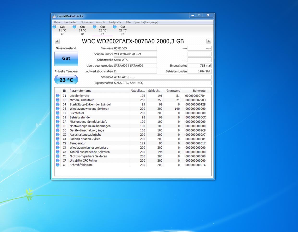 Welche SSD hast Du und warum willst Du diese Ordner auslagern? Schonen muss man SSDs nicht, das ist Quatsch. Wenn Du die auf eine HDD auslagerst, wird der Zugriff nur viel langsamer, ggf. muss die Platte aus dem Unload aufwachen. Die hat 0x384 = 900 Load-Unload Zyklen bei 715 Einschaltungen, vorher (#26) waren es 0x362 = 866 LLC bei 700 Einschaltungen, also 34 LLC mehr und nur 15 davon wegen der Einschaltungen, die Platte geht also nach einiger Zeit in den Unloadzustand, was sie früher, also sie wohl noch das Systemlaufwerk war und damit dauernd Zugriffe von Windows erfolgt sind, wohl nicht gemacht hat.