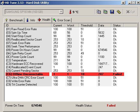 ich hab gerade mit HD-Tune den Health-Status meiner Festplatte überprüft und dabei kam es zu der im Anhang sichtbaren Fehlermeldung. Hab auch die Sectoren mal mit Quick-Scan gescannt, waren alle in Ordnung momentan läuft noch der ausführliche Scan. Mich würde nun interessieren ob ich davon ausgehen muss, dass die Festplatte in absebarer Zukunft den Geist aufgibt oder was man ggf. gegen den Fehler machen kann und ob es am Ende gar sinnvoller wäre die Festplatte jetzt zu tauschen.