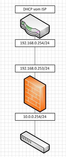 Der Router/Modem ist ein Pirelli PBS-6DOC65. Die Firewall eine Cisco PIX501. Wie auf dem Bild ersichtlich ist das interne Netz ein 10.0.0.0/24 und das Netz zwischen Firewall und Router/Modem ein 192.168.0.0/24. NAT ist in der PIX deaktiviert. Eine statische Route liegt am outbound Interface (0.0.0.0 0.0.0.0 192.168.0.254).