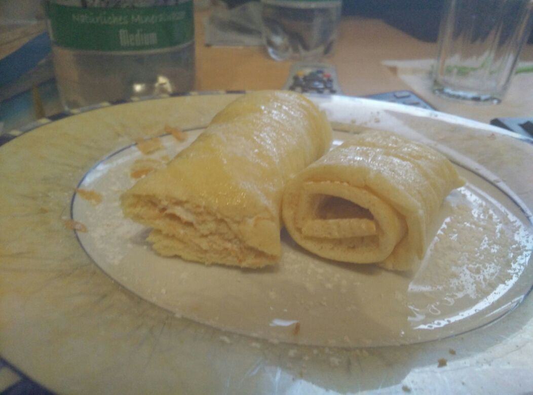 Buiscuitrolle mit Quarkfüllung - normalerweise Früchtequark aber hab leider nix da gehabt - recht lecker mit 85g Eiweiß pro portion (3x die Menge wie aufm Foto)
