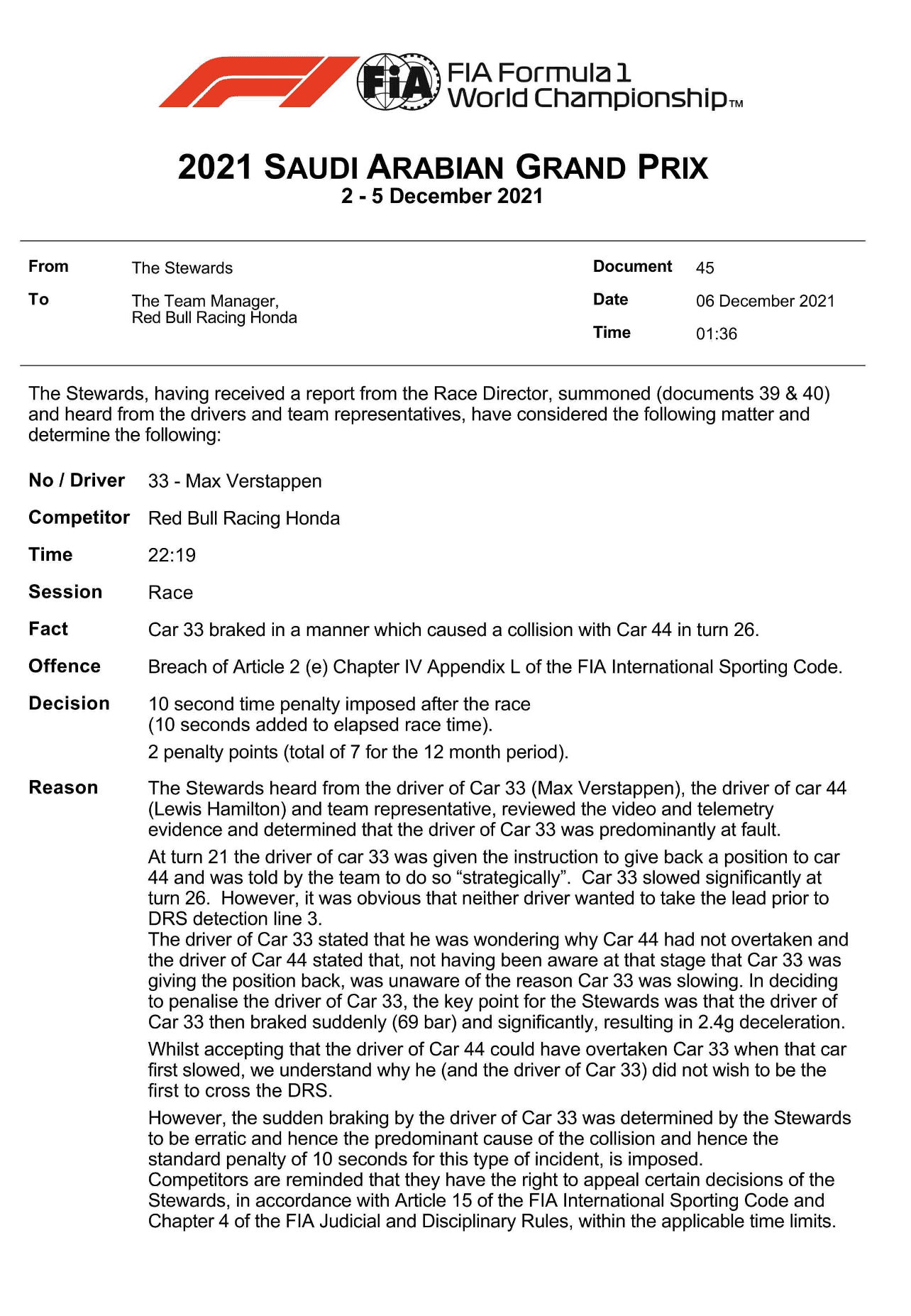 Die FIA sagt aber auch, dass VER mit dem Bremsmanöver „unberechenbar“ gehandelt habe.