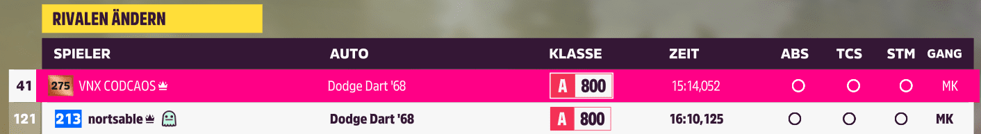 Also um den Erfolg zu haben muss die Runde sauber sein. Wenn dein Rivale eine saubere Runde hat, dann musst du ihn schlagen, wenn die Zeit vom Rivalen hinten das gelbe ausrufezeichen hat, dann kannst du auch langsamer sein.