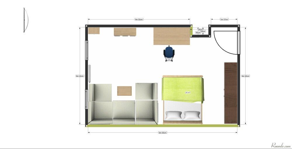 Eventuell wäre auch noch ein Raumteilerspalier recht´s vom Bett interessant um mehr das Wohlfühlen des rechts Liegenden zu bedenken.