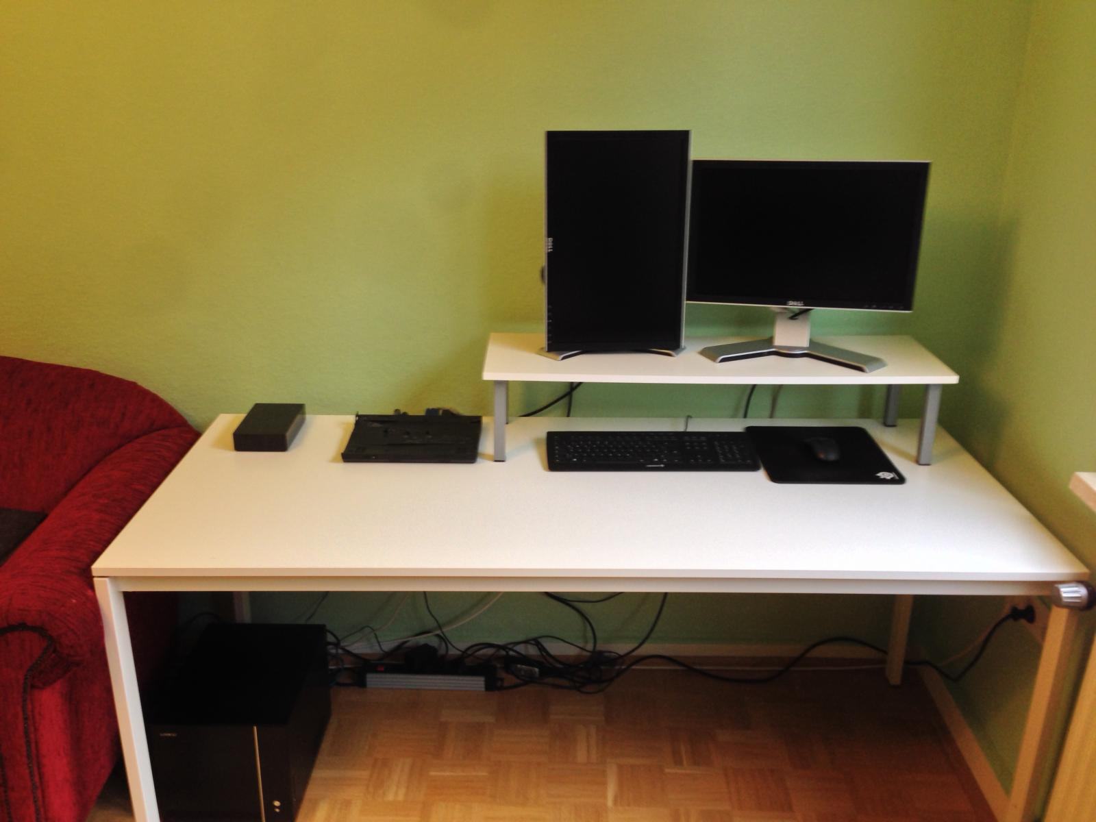 Hey, habe endlich eine Übergangslösung zusammengebastelt die es mir erlaubt die Monitore auf einer ergonomischen Höhe zu habe. Ohne Bücherstapel... xD