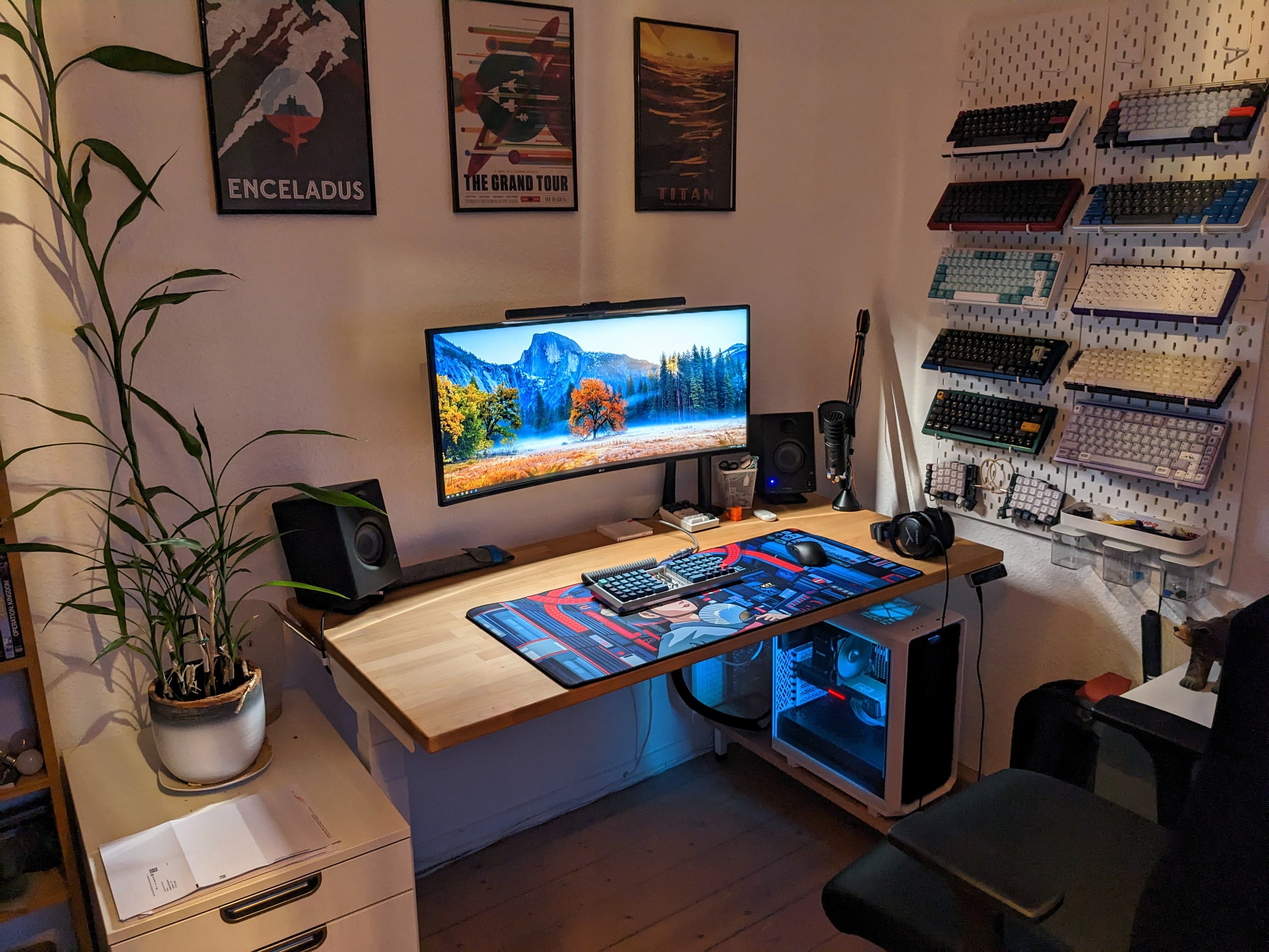 Schreibtisch ist ein Flexispot E7 mit einer Buche Massivholzplatte 140*70cm. PC unterm Tisch mittlerweile, da auf dem Tisch nicht mehr genug Platz war. Monitor ist ein LG34GN850, Lautsprecher Presonus Eris3.5, Maus eine Lamzu Atlantis und Tastatur(en): viele