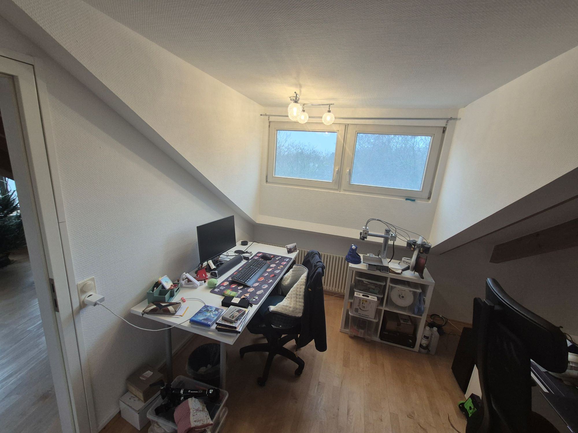 Dazu ist die Dachschräge am anderen Schreibtisch noch so eine ungenutzte Ecke. Man kann nicht Richtig was drunter, darauf, hinstellen.