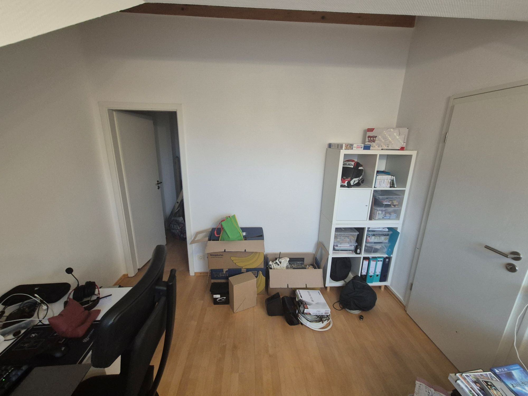 Aktuell stehen hier einfach die Schreibtische aus der alten Wohnung, die sind "einfach" 150x75 und schon was älter. Dazu übergangsweise ein paar alte Kallax als Stauraum und natürlich noch Kisten Kisten Kisten...