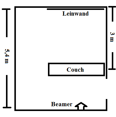 Geplant ist, den Beamer über einer Wand zu befestigen, die ca. 5,4m entfernt von der Leinwand wäre. Die Couch befindet sich in einem Abstand von ungefähr 3m zur Leinwand. Das Ganze sieht dann so aus: