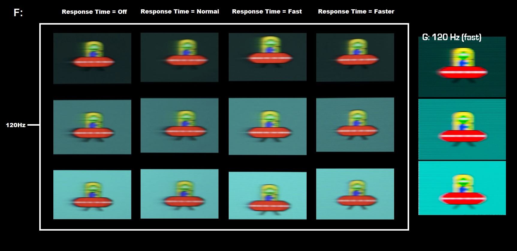 Wo denn ? Siehst du den Schweif nicht ? Es stimmt einfach nicht dass das F Modell ähnliche Schaltzeiten wie das G Modell hat. Das Ding sieht vom Schweif beim Ufotest her fast genauso aus wie ein VA Panel.