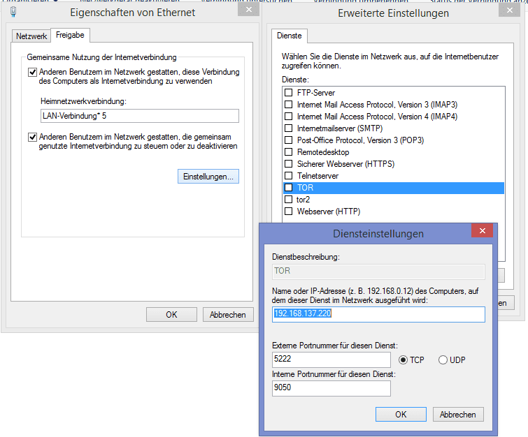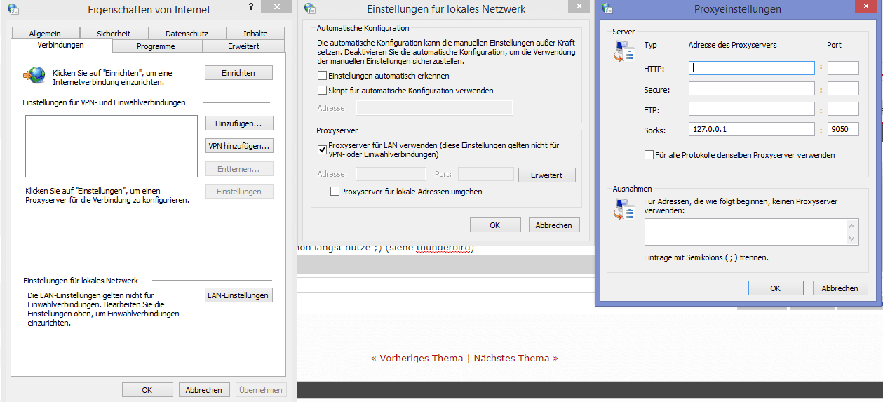 ich habe probehalber mal tor in den internetoptionen -> Verbindung -> LAN-Einstellungen angegeben, aber das funktionierte nicht.