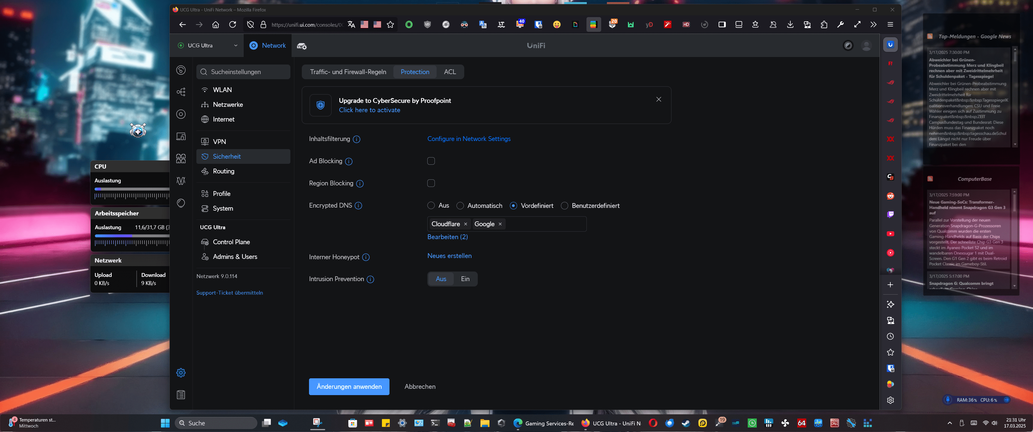 Allerdings ist jetzt der Controller mit Firewall hinzugekommen. Die ist auch eingerichtet und funktioniert auch ganz gut, allerdings wird die Internetverbindung von Zeit zu Zeit sporadisch unterbrochen und die UCG meldet immer beim Einloggen eine Orange Warnung mit Packetloss by ISP. Dieses Problem habe ich erst, seit die UCG Pro hinzugekommen ist.