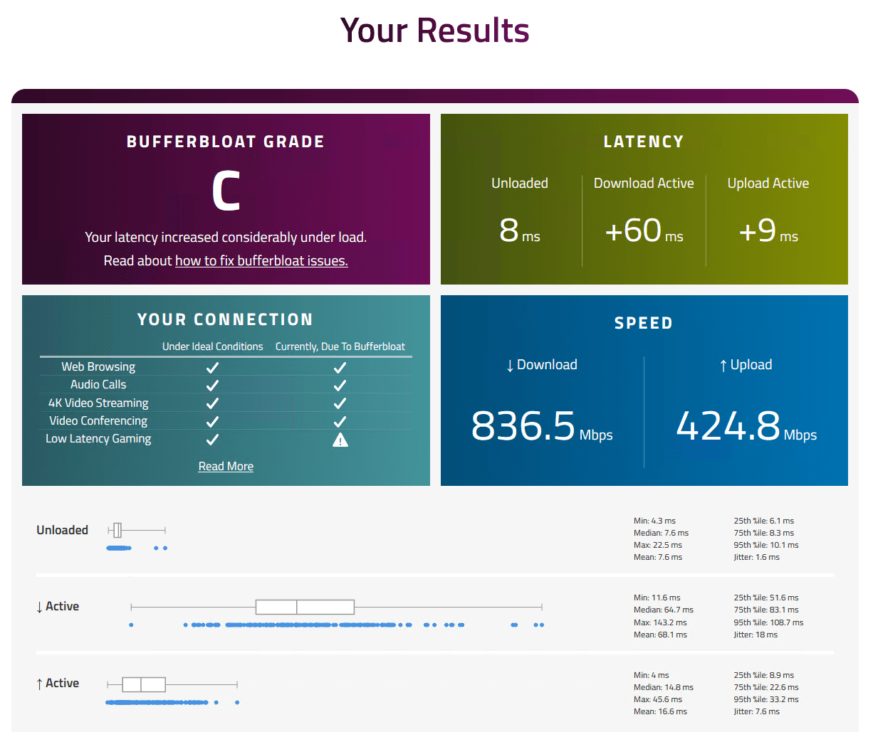 Nun habe ich es final aber doch geschafft den Bufferbloat bis ins kleinste zu minimieren und sowohl auf Speedtest.net als auch auf Waveform auf ein super Ergebniss zu kommen, was sich auch beim zocken bemerkbar macht.