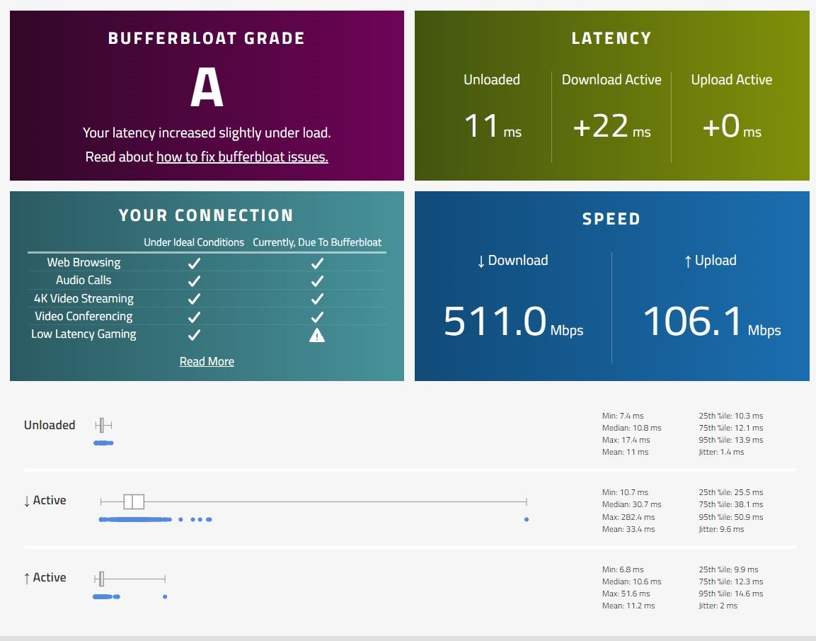 Ich bin der Sache mit dem Bufferbloat nie so richtig nachgegangen, weil es immer hieß, dass das nur dann relevant wäre, wenn die Leistung ausgelastet ist. Das stimmt aber zu 1000000% nicht!