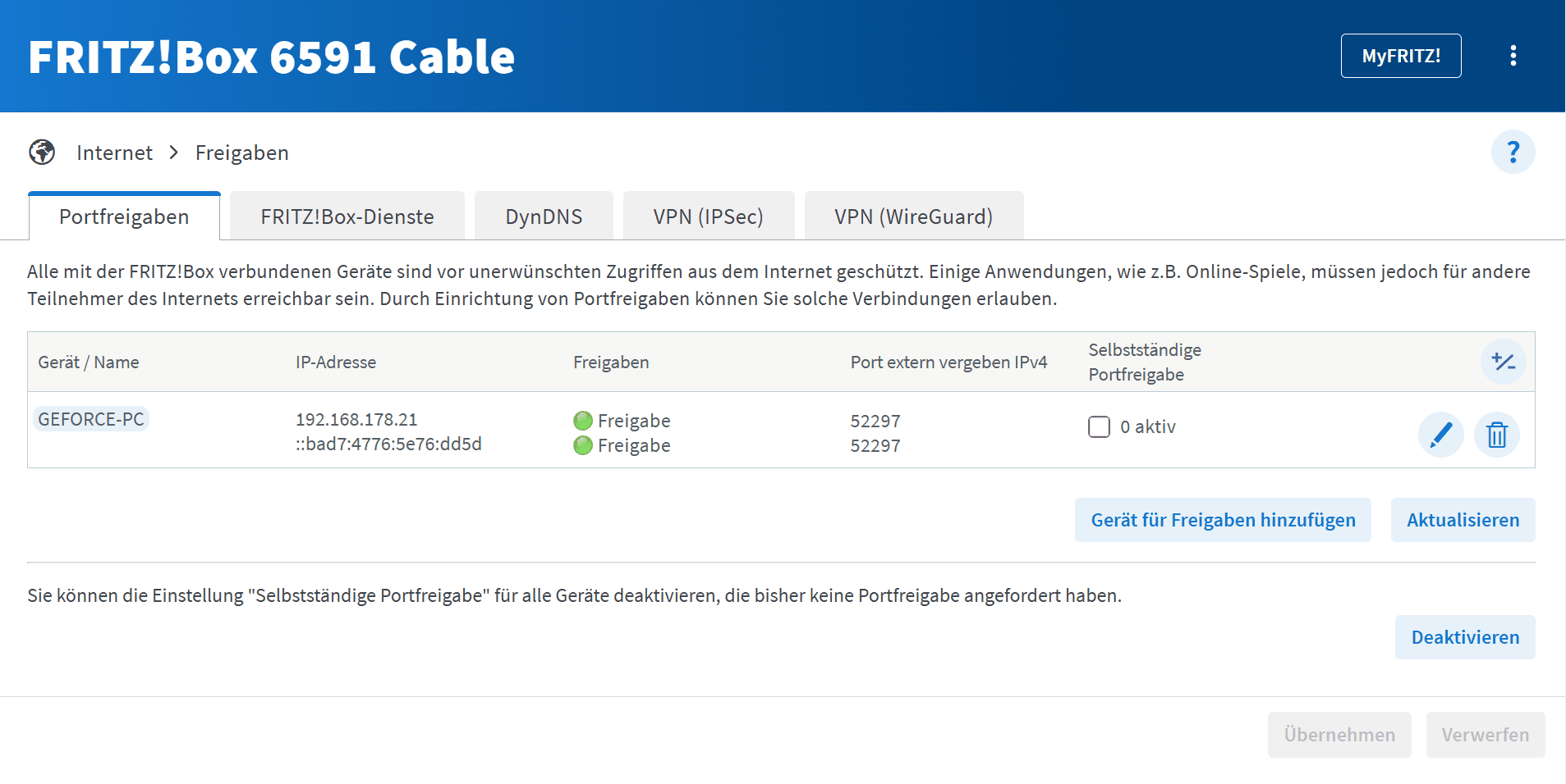 Es ist zum Haareraufen, ich habe Windows neu aufgesetzt und plötzlich werden sämtliche Ports die in der Fritzbox 6591