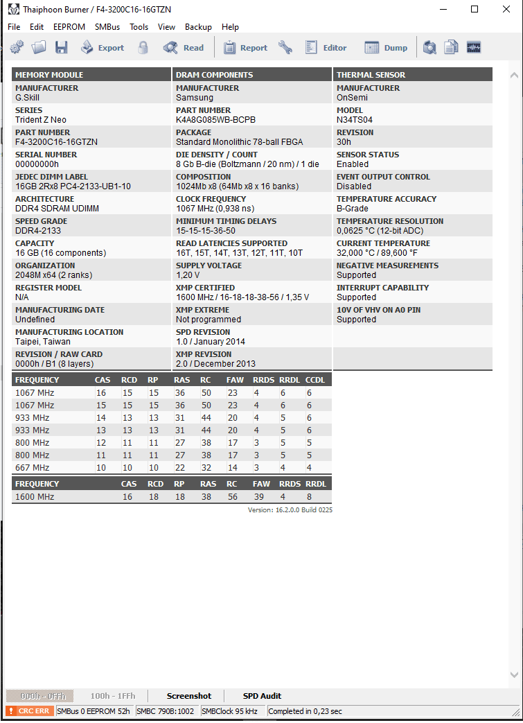 Hast du verfiziert, ob der Fehler sich ändert? Denn heutzutage deutet ein CRC Fehler in den meisten Fällen darauf hin, dass beim Auslesen mit TB irgendeine andere Software dazwischen gefunkt hat. Denn die Funktion SPD Write, sollte bei jedem Mainboard standardmäßig deaktiviert sein (und es auch bleiben). So dass überhaupt kein Schreibzugriff auf das SPD möglich ist, der einen CRC Fehler verursachen könnte.