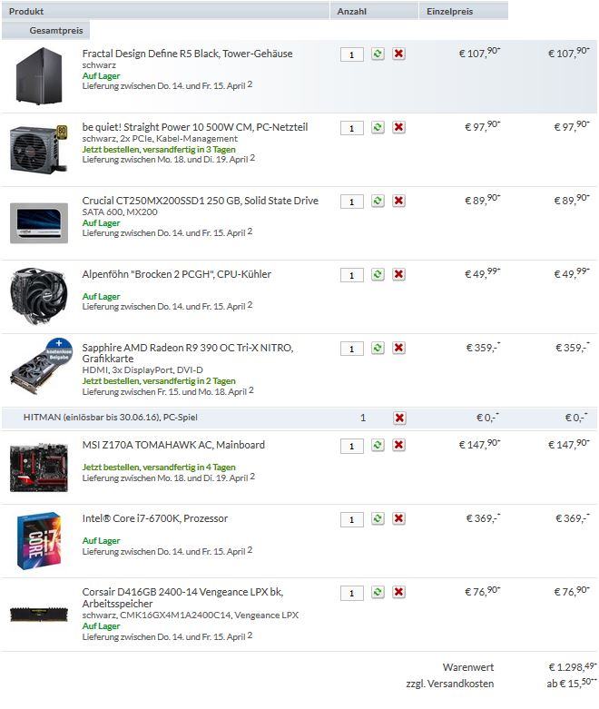 du musst rechts oben auf der seite noch den "Montage- und Funktionstest-Service" für 99 euro in den warenkorb legen, damit der rechner von mindfactory zusammengeschraubt wird. damit kämst du ziemlich genau auf 1600 euro inkl versand, allerdings bekommste wegen des mainboards noch 40 euro zurück.