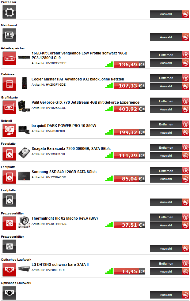 Waren so die ersten Ideen. Bei CPU und Mainboard waren wir uns eher unsicher. ob i5 oder i7 - und welchen... Soll nicht übertaktet werden.